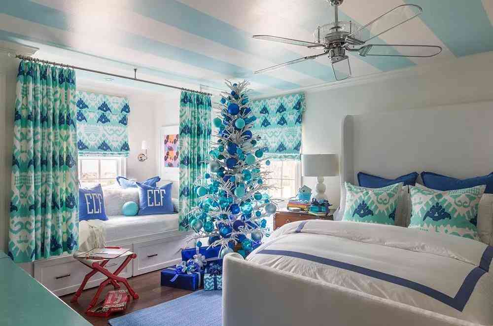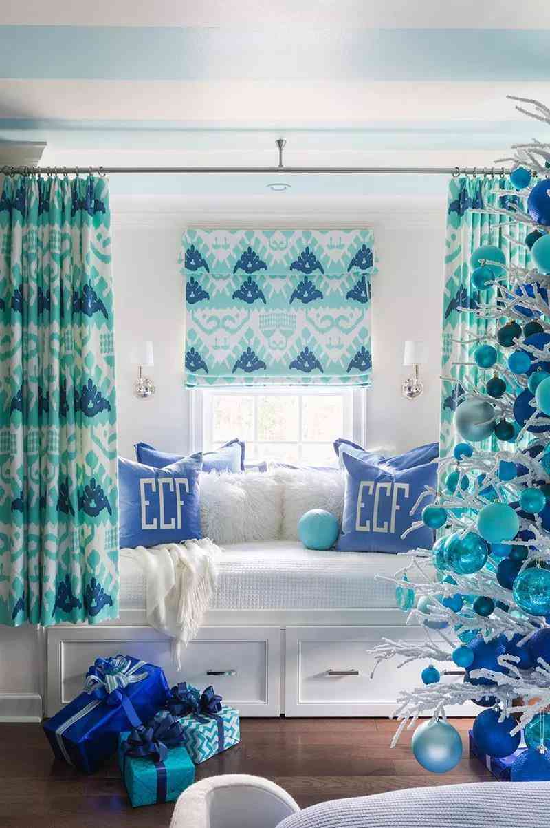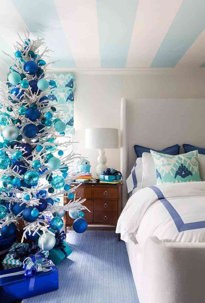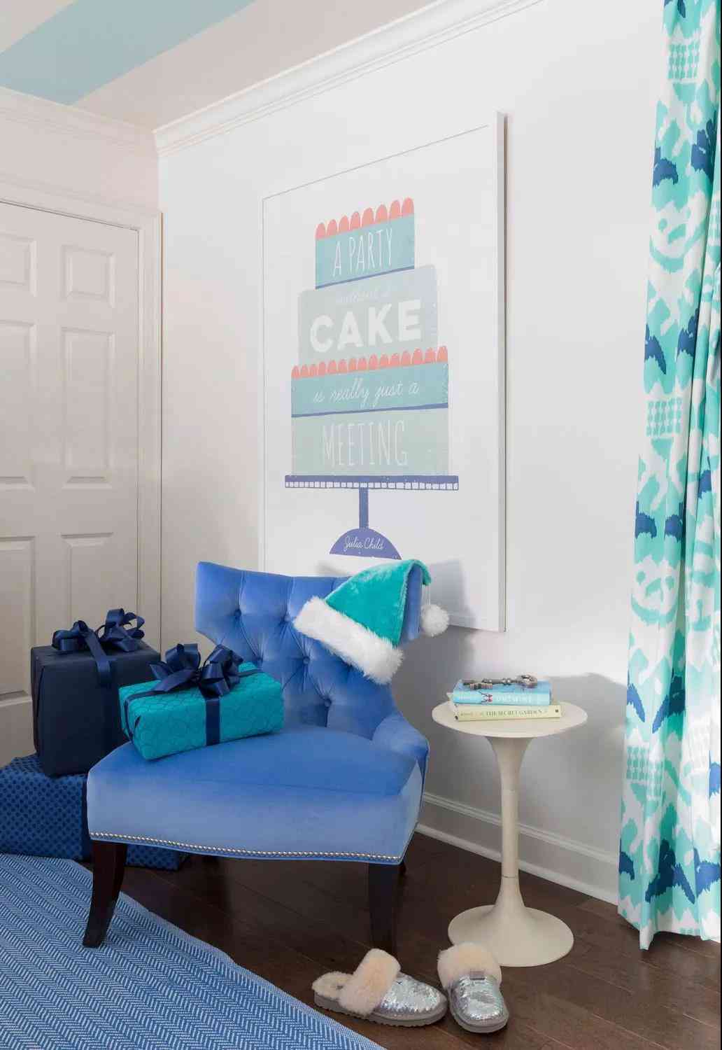 與餐廳里采用代爾夫特藍為墻壁主色寓意海洋的方式截然不同,兒童房的整個設(shè)計和陳設(shè)強調(diào)冬雪圣誕的浪漫和童趣。圣誕樹被大大小小的藍色球體包裹,搖身一變成為時尚的藝術(shù)展覽品。亮白色傳遞著冬日晴雪的歡樂景象與Tiffany blue組成成倍的快樂和浪漫。矢車菊藍點綴在這些繽紛藍色之間,越發(fā)使得空間飽滿而豐富多彩。選擇肉豆蔻色的地板和在餐廳里的設(shè)計用心一樣,看似低調(diào)而略顯紅棕的屬性,能夠令空間散發(fā)暖意,緩和藍色調(diào)帶來的冷清感。