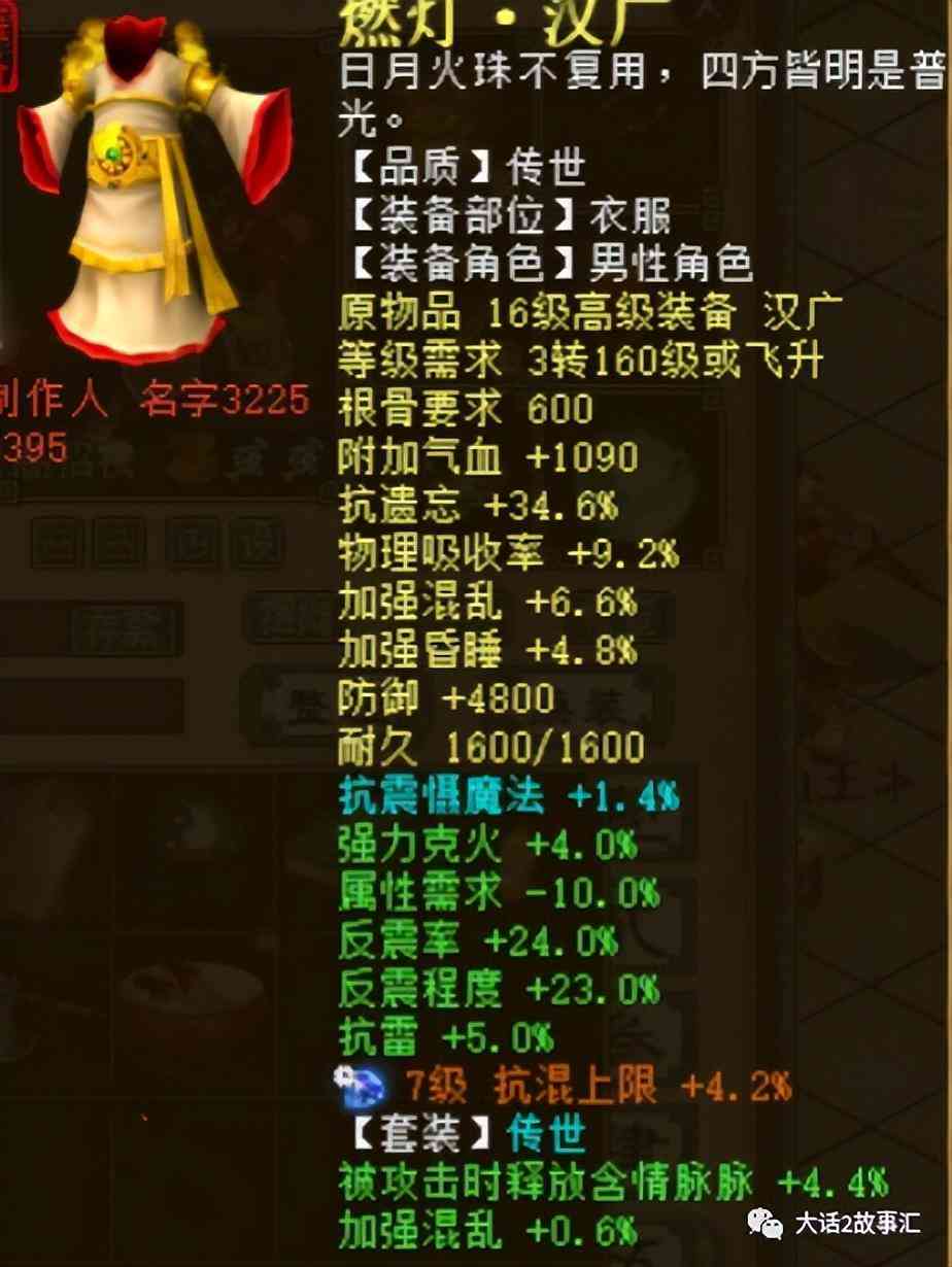 燃燈的衣服底子是抗遺忘34.6,抗物理9.2,加強混亂6.6,煉化效果屬性需求-10%,反震率24,反震程度23,套裝綠字加強混亂0.6,細節(jié)到位。