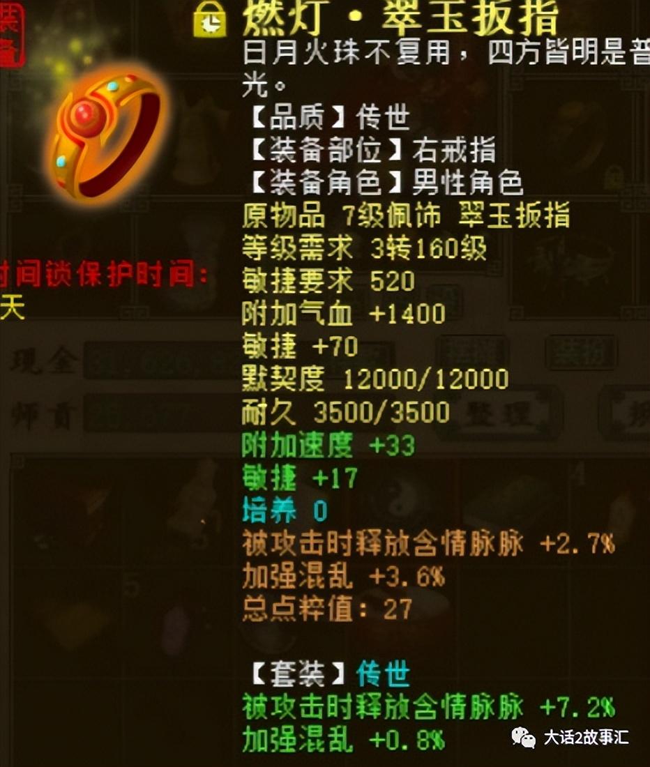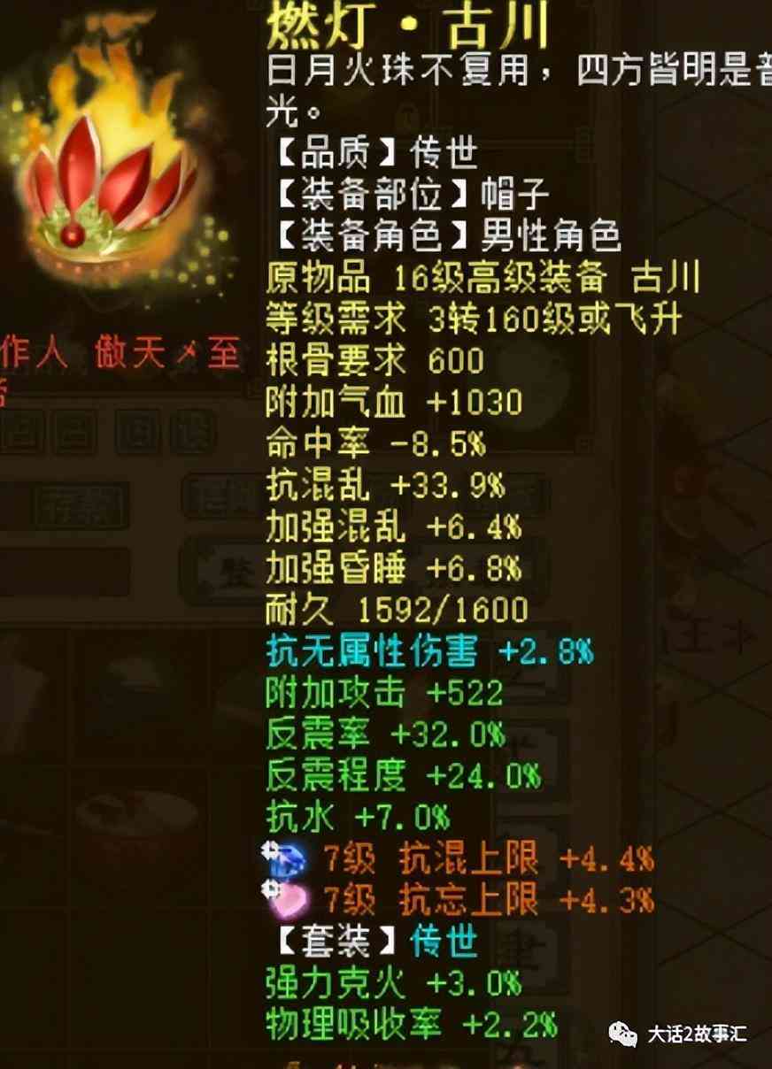 燃燈的帽子底子是抗混亂加33.9,加強混亂加6.4,煉化效果反震率32,反震程度24,套裝綠字并沒有洗到位。衣服和帽子明顯是用心搭配的反震煉化。