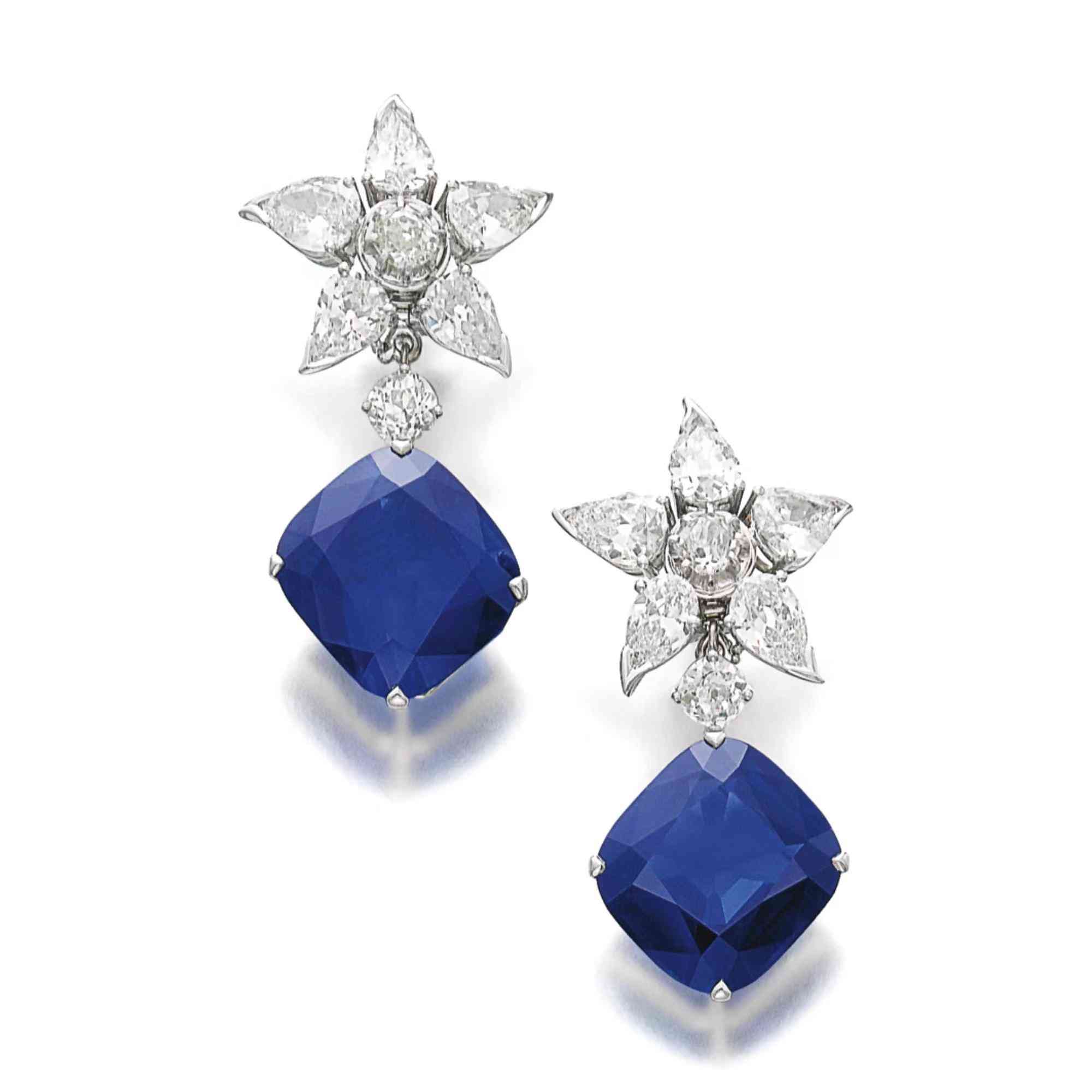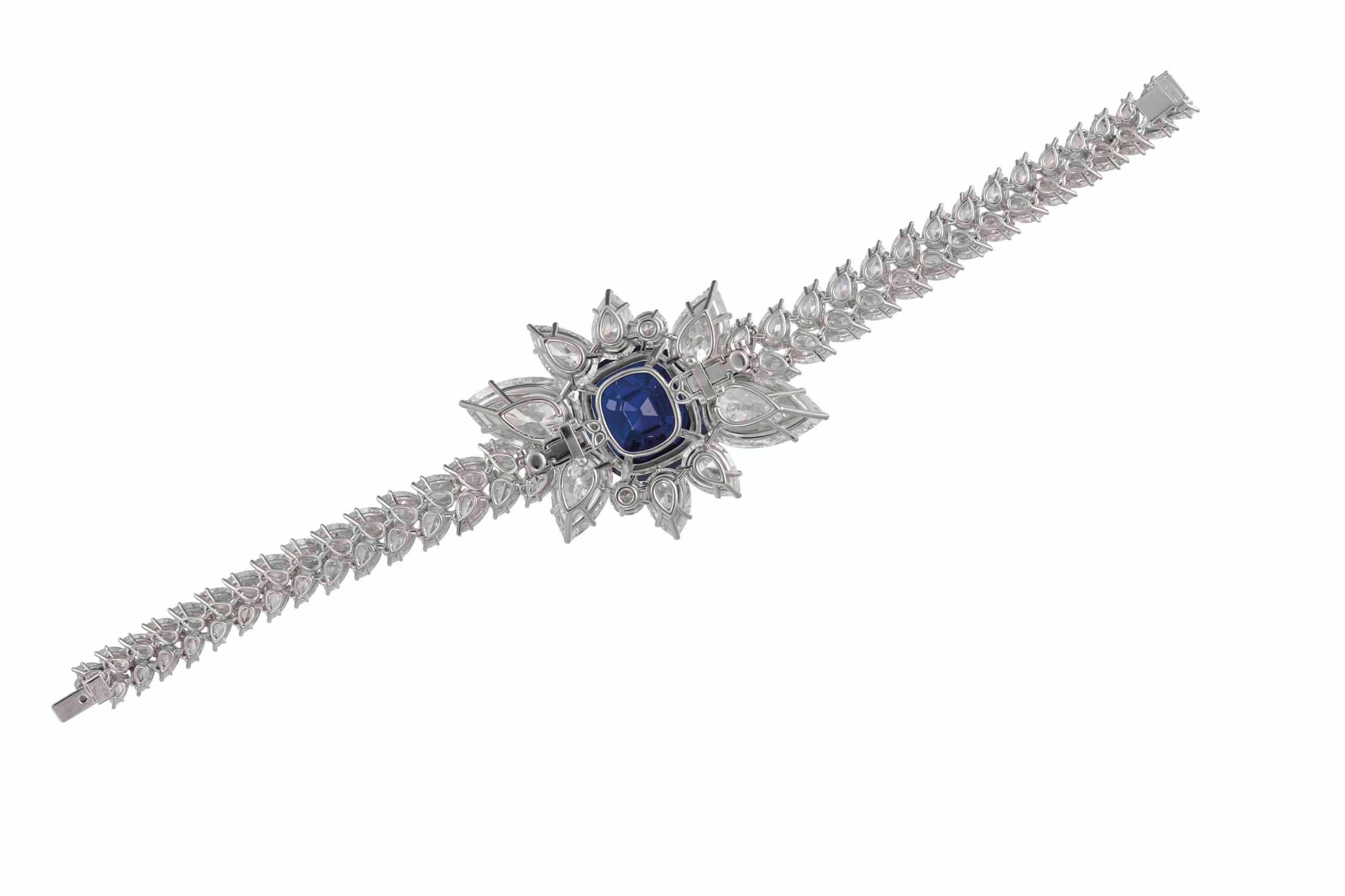 這顆枕形藍寶石重 30.23 克拉,鑲嵌總重約 42.35 克拉的欖尖形和水滴形鉆石,由卡地亞簽名、編號和印有卡地亞表殼編號,此外還有法國化驗和印度的部分制造商標記。這顆藍寶石天鵝絨般濃郁的藍色色調是令人難以置信的微小、無法檢測的內含物和均衡的微量元素混合的結果,這些元素是最好的克什米爾藍寶石所特有的。