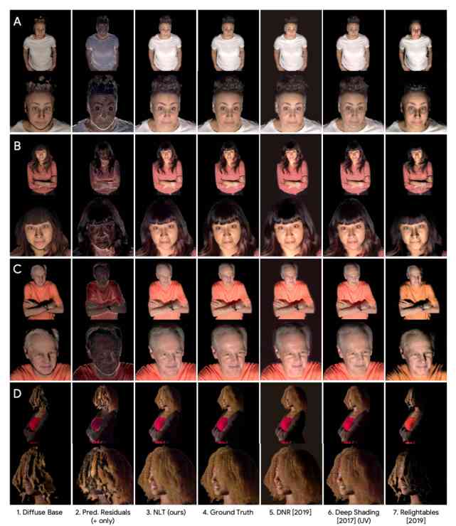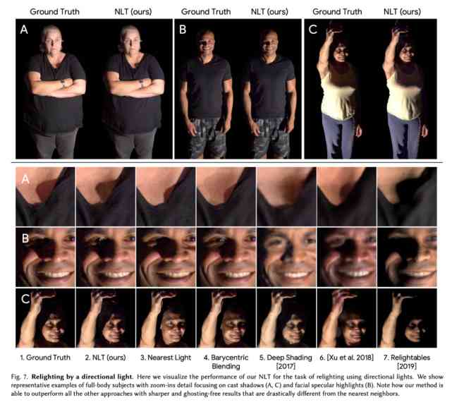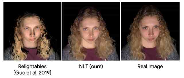 圖 2:之前的 Relightables 方法(Guo 等人,2019 年)、該研究提出的 NLT 方法和真實圖像之間的真實感差距。