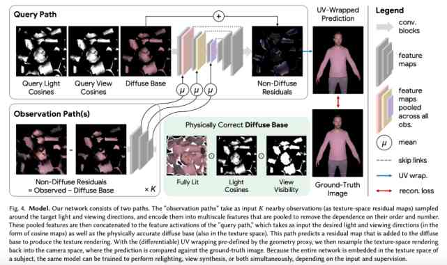 模型網絡包含兩個路徑,分別是查詢路徑(Query Path)和觀察路徑(Observation Path)。其中「觀察路徑」以基于目標光源和視角方向采樣的 K 個臨近觀察結果(作為紋理空間殘差圖)為輸入,并將它們編碼成多尺度特征,最后將這些特征池化以消除對順序和數量的依賴。