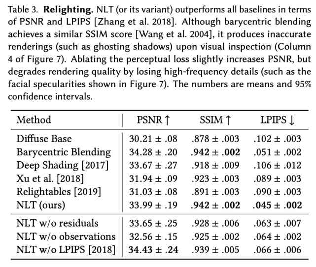如下表 3 所示,研究者對 NLT 方法與 Diffuse Base、Barycentric Blending、Deep Shading 等其他二次打光基線方法進行了定量評估,以 PSNR(峰值信噪比)、SSIM(結構相似性)和 LPIPS(學得感知相似性)作為評估指標。