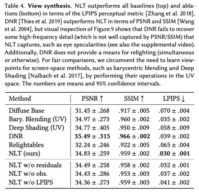 結果表明,NLT 方法的性能優(yōu)于所有的基線方法,但 Diffuse Rendering 和 Barycentric Blending 等簡單的基線方法也取得了較高的分數。