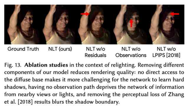 如下圖 13 所示,研究者在二次打光任務上進行了 NLT 方法的控制變量研究。結果顯示,去除模型的不同組件會不同程度地降低渲染質量。