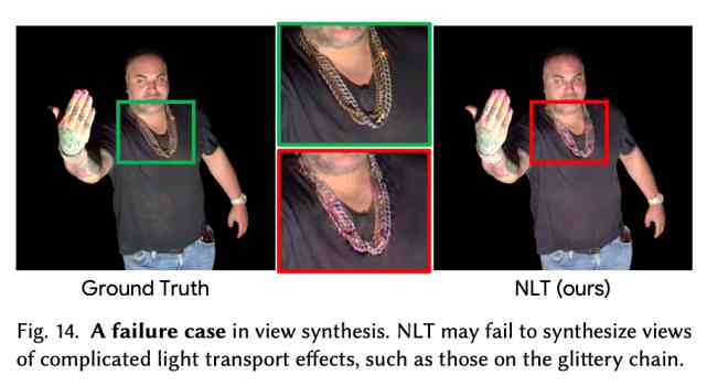 當然,NLT 方法在視圖合成時也出現(xiàn)了失敗的案例。如下圖 14 所示,NLT 方法可能無法生成復雜光傳輸效果的真實視圖,如脖子上所戴項鏈的視圖。