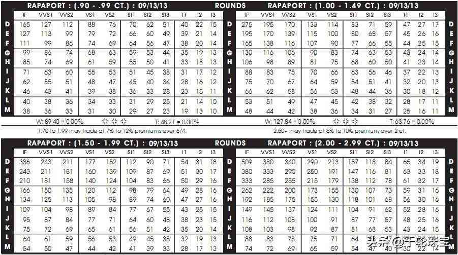 在1978 年,一位來(lái)自鉆石家族的馬丁?雷派波特,將紐約市場(chǎng)上所收集來(lái)的鉆石平均交易價(jià)格,按照成色、凈度和克拉數(shù)整理表列,制定出一份的標(biāo)準(zhǔn)化的報(bào)價(jià)單每周印行,英文稱(chēng)做Rapaport Diamond Price List(鉆石價(jià)格表),從此,鉆石有了透明化的國(guó)際參考價(jià)格,買(mǎi)賣(mài)雙方有了共同的依循基準(zhǔn),鉆石的分級(jí)也因影響價(jià)格甚鉅而更加受到大家的重視。