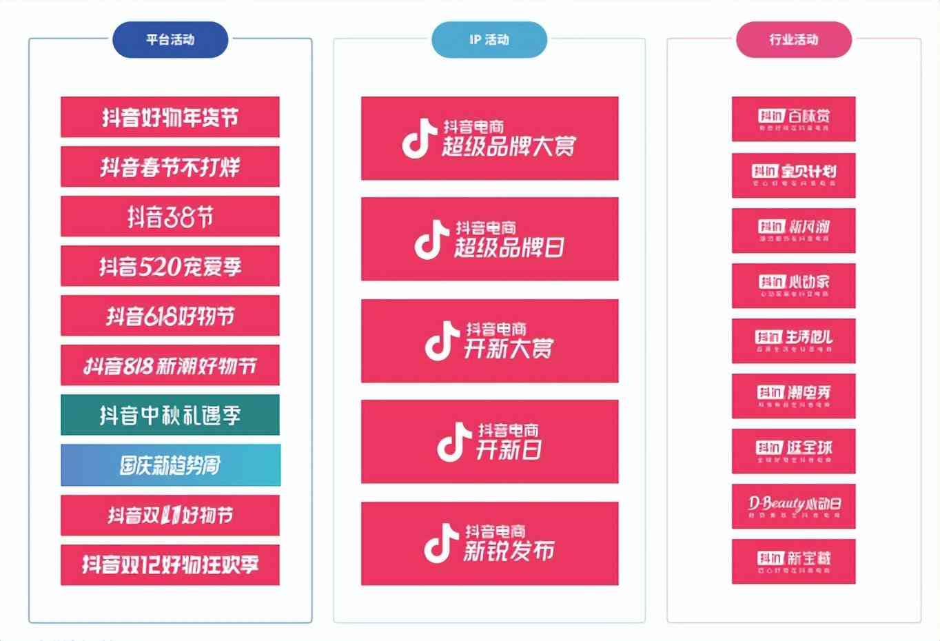 而抖音電商的官方活動(dòng)的出現(xiàn),很大程度上填補(bǔ)了這一痛點(diǎn),幫助新品牌實(shí)現(xiàn)品效雙爆發(fā)。包括營(yíng)銷活動(dòng)(全年平臺(tái)和行業(yè)活動(dòng):大促節(jié)點(diǎn)、日常節(jié)日)和營(yíng)銷 IP(平臺(tái)IP:抖音電商超級(jí)品牌日等;行業(yè)IP:抖in寶貝計(jì)劃等)