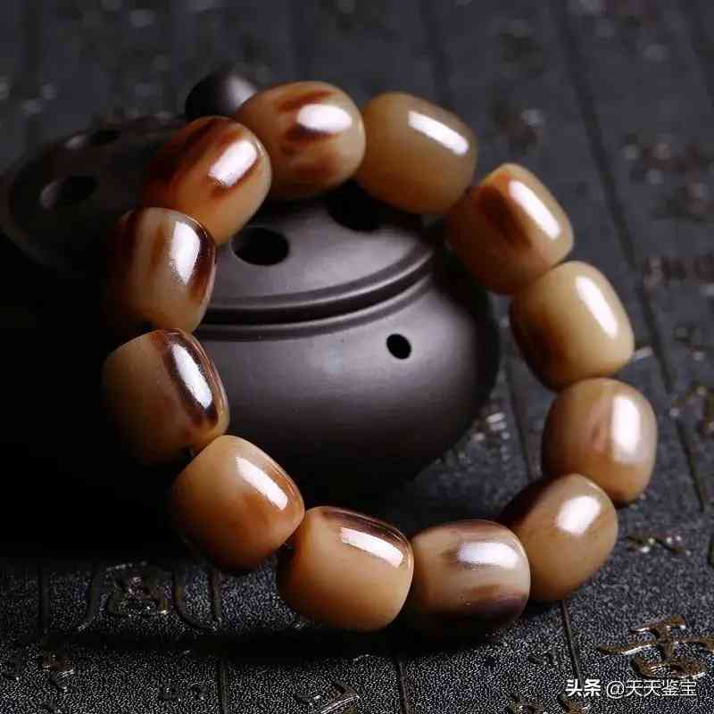 色黃黑相間,表面光亮,無橫紋有縱紋,很堅韌。牦牛角手串上手溫潤不涼,手感非常細膩,盤玩佩戴時讓人愛不釋手。