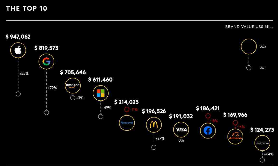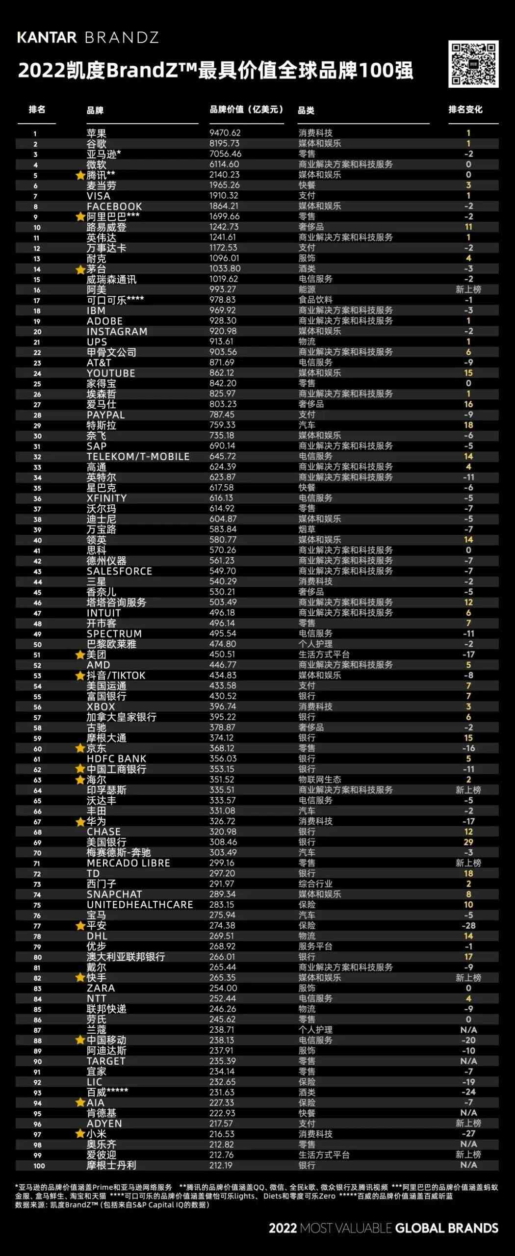 國際市場咨詢機(jī)構(gòu) Kantar Millward Brown (凱度)公布了2022年度 BrandZ 全球最具價(jià)值100強(qiáng)品牌榜單(BrandZ Most Valuable Global Brands 2022)