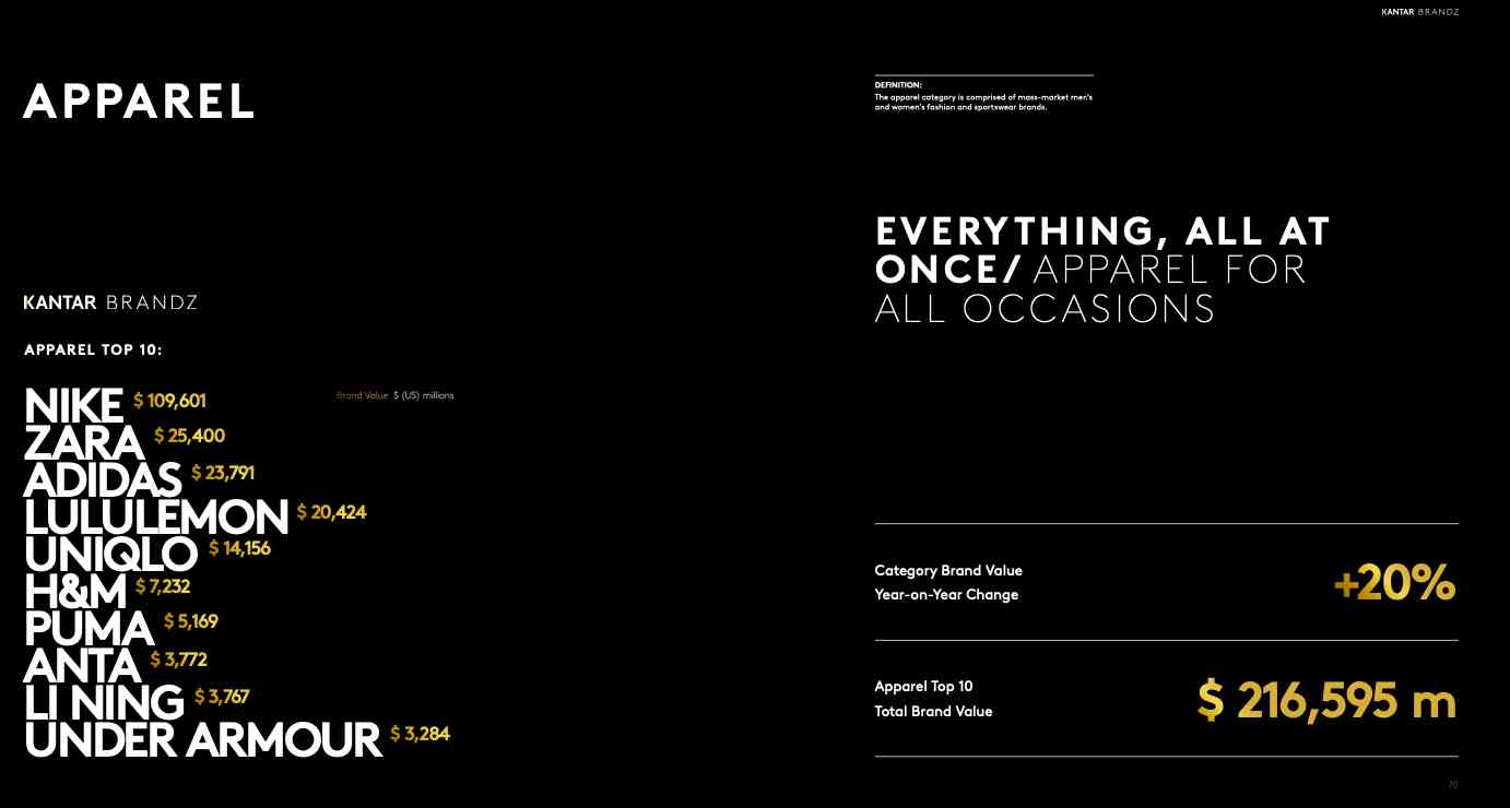 服裝類別已經(jīng)開始復(fù)蘇——過去的一年也不例外,領(lǐng)先品牌的價(jià)值繼續(xù)上升,服裝類十大品牌的總價(jià)值增長了20%至2165.95億美元。凱度表示,這一增長歸功于“領(lǐng)先品牌的品牌價(jià)值持續(xù)上升”。