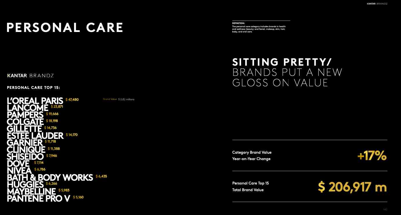 今年對于個(gè)護(hù)品牌來說是強(qiáng)勁的一年,個(gè)護(hù)類十五大品牌的總價(jià)值增長了17%至2069.17億美元。