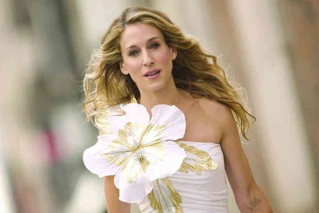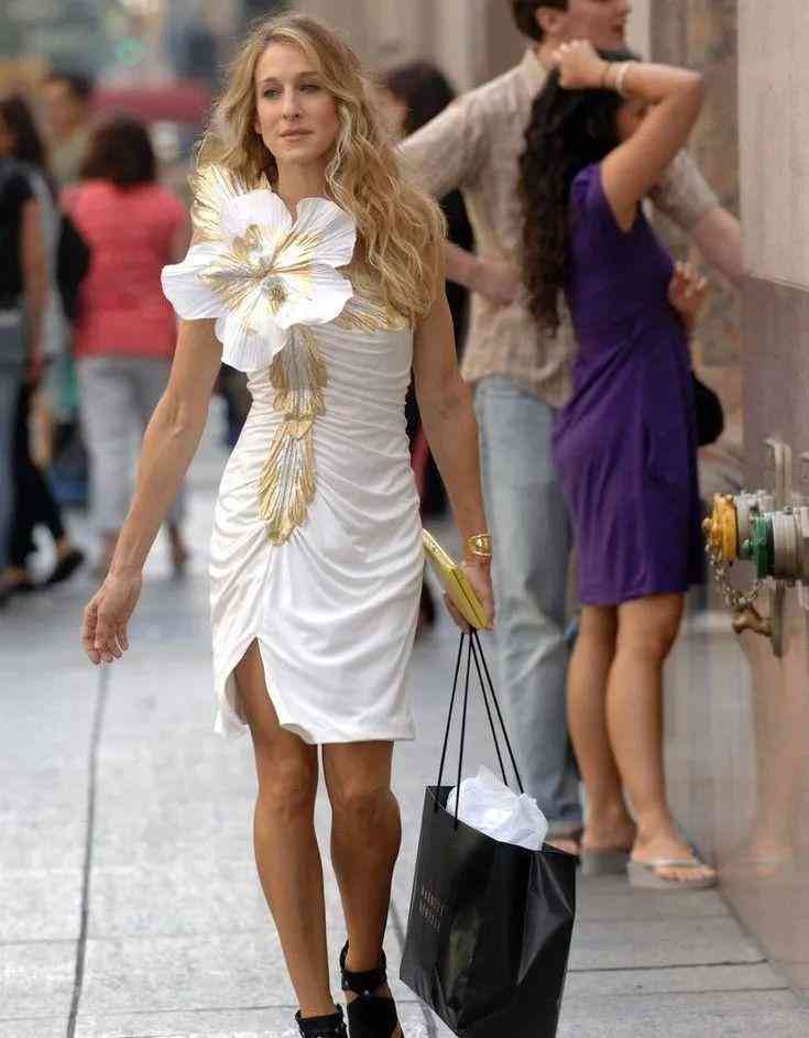 每每重現(xiàn)都能勾起劇迷們的集體回憶,比如2008年電影版的開場,這身像鍍了金箔的白色花朵禮裙造型,就是Carrie的經(jīng)典時裝時刻之一。