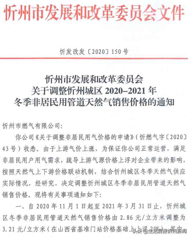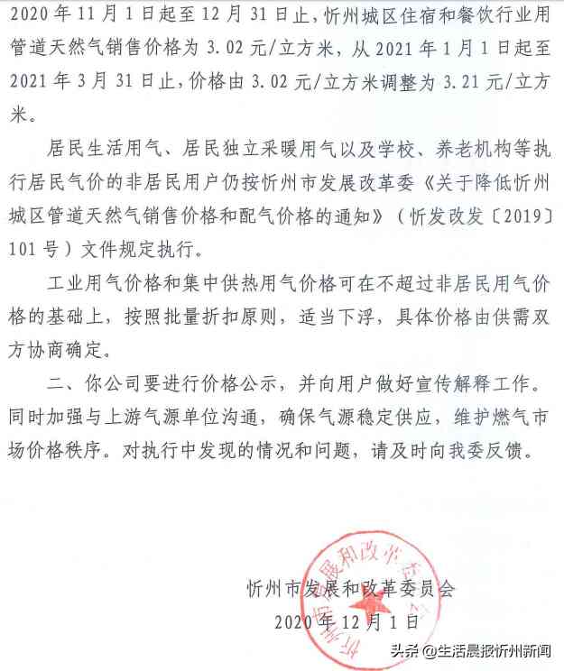 一、自2020年11月1日起至2021年3月31日止,忻州城區(qū)冬季非居民用管道天然氣銷售價(jià)格由2.86元/立方米調(diào)整為3.21元/立方米(在山西省基準(zhǔn)門站價(jià)格基礎(chǔ)上上浮20%)。其中, 2020年11月1日起至12月31日止,忻州城區(qū)住宿和餐飲行業(yè)用管道天然氣銷售價(jià)格為3.02元/立方米,從2021年1月1日起至2021年3月31日止價(jià)格由3.02元/立方米調(diào)整為3.21元/立方米。