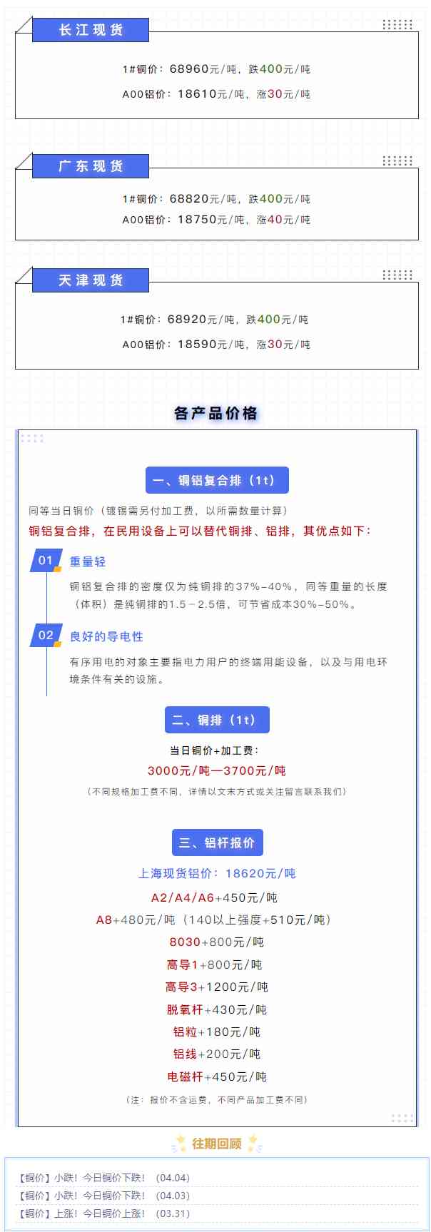 今日銅價(jià)下跌!長(zhǎng)江現(xiàn)貨,廣東現(xiàn)貨,上海鋁桿價(jià)格公示(04.06)