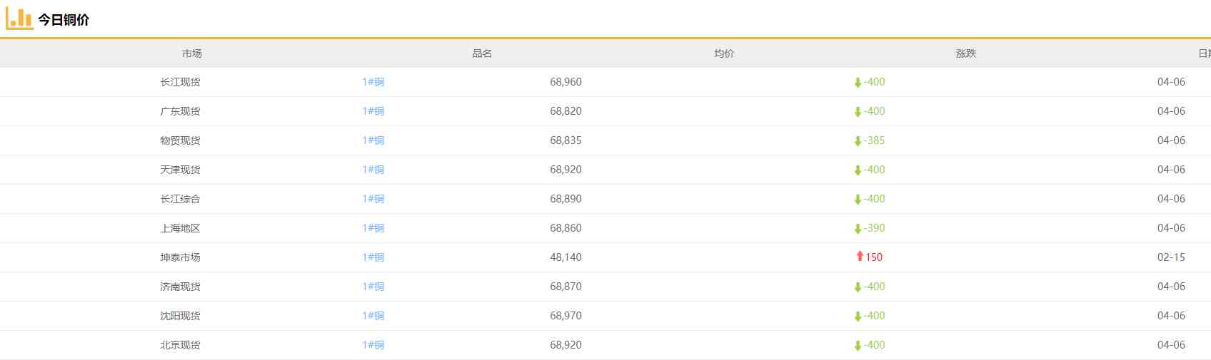 【現(xiàn)貨】4月6日各地區(qū)現(xiàn)貨銅價(jià)格匯總
