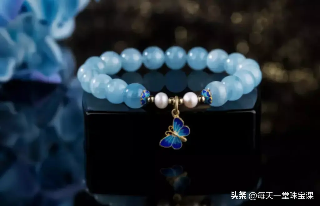 另外,有些內(nèi)含物較多的海藍(lán)寶石不適合制作成刻面,就會(huì)有其他出路,例如打磨成珠子,制作手串: