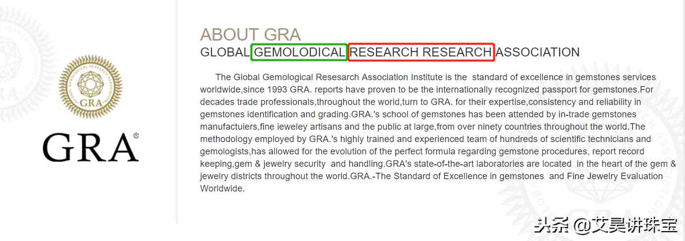 看看下圖是GRA官方介紹,全英文的,如果英語(yǔ)差一點(diǎn),讀起來(lái)還有點(diǎn)吃力的,首先看題目,綠色方框中的”GEMOLODICAL”真心的不知道是什么意思,單詞量實(shí)在不夠,我只認(rèn)識(shí)寶石學(xué)”GEMOLOGICAL”,另外,英文什么時(shí)候開始使用疊詞了?紅色方框中赫然有兩個(gè)RESEARCH,剩下的就是英文的介紹了,外語(yǔ)好一些的,可以嘗試著翻譯翻譯。
