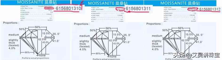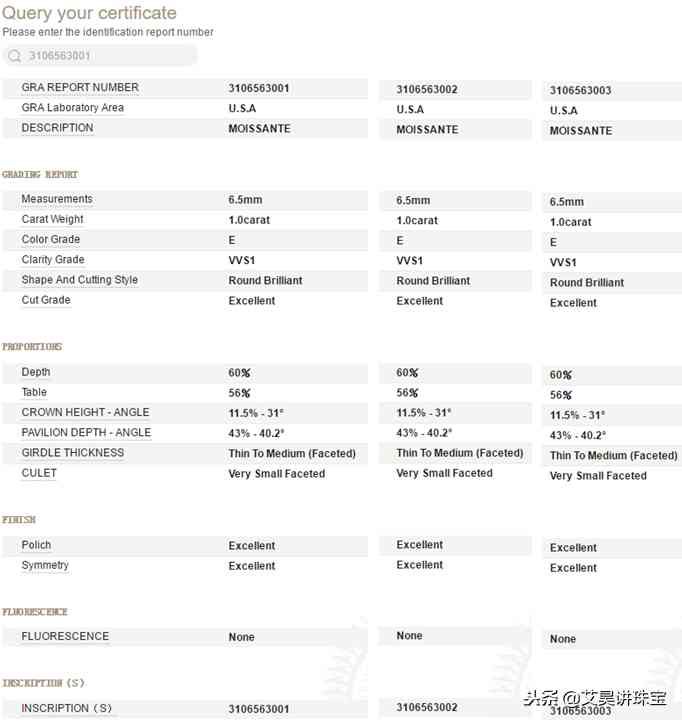 讓我們?cè)诳匆幌伦C書中的具體的內(nèi)容,利用三個(gè)證書編號(hào)進(jìn)行了查詢,我們可以看到證書中所有的內(nèi)容一模一樣的,雖然說(shuō)莫桑石是合成品吧,那也不能完全一模一樣啊,重量、顏色、凈度、切工統(tǒng)統(tǒng)全部是一樣的,這哪是出證書???這根復(fù)印機(jī)相比,好像也沒(méi)有什么特別大的差別。