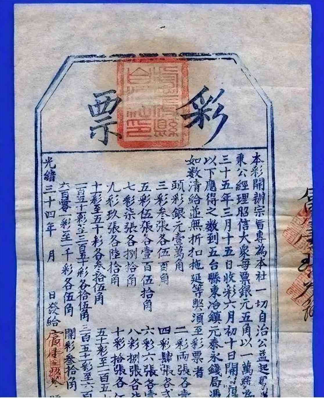 既然官方開了口,晚清彩票的種類,一下子多了起來,有的公司破產(chǎn)后,就拿所剩資產(chǎn)充當(dāng)獎(jiǎng)品,通過彩票償還債務(wù)。