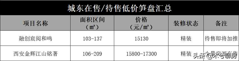 城東板塊目前在售/待售項(xiàng)目不多,有:龍湖天耀、紅星·天鉑、融創(chuàng)宸閱和鳴、西安金輝江山銘著等。其中,價(jià)格較低的融創(chuàng)宸閱和鳴值得關(guān)注。